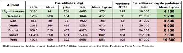 Il faut donc 7 300 L d'eau pour obtenir 1 kg de protéines de bœuf contre 5 200L pour 1 kg de protéines de céréale. Les protéines animales sont plus coûteuses en eau que leurs équivalentes végétales et la protéine animale la plus coûteuse en eau correspond à celle du porc.