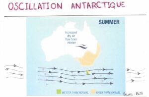 Durant été 2019-2020, l'Australie est sous influence d'une phase négative de l'Oscillation Antarctique en été (les vents d'Ouest sont plus au Nord que la normale).Elle est causée par un réchauffement stratosphérique soudain et elle modifie les conditions météorologiques en l'Australie : augmentation des chances d'une vague de chaleur, diminution des précipitations dans l'Est et le Sud-Est du pays et augmentation des coups de vent sur le Sud-Ouest.