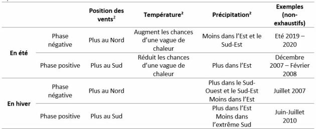 Comme les vents d'Ouest sont porteurs des dépressions, les conditions météorologiques sont impactées par ces changements de position de ce dernier. Cependant, elles sont différentes en hiver et en été car la position des vents d'Ouest est plus au Nord en hiver. Les conditions météorologiques sont résumées dans le tableau ci-dessous.