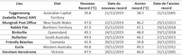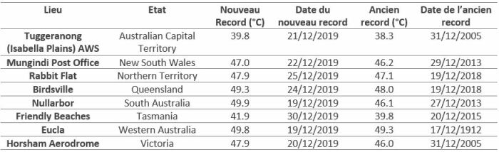 De nombreuses villes dans tout le pays ont vu leur record de température maximale battu. Le tableau ci-dessous récapitule certains records battus durant Décembre 2019 en qui ont été relevé :