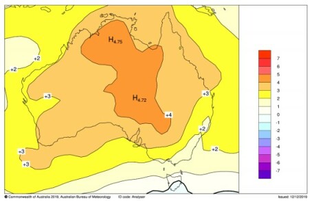 Ce manque de précipitation est lié à la stationnarité de l'anticyclone comme le montre la figure ci-dessous (Mean sea level pressure anomalies for spring 2019 (from the ACCESS-G model relative to NCEP II Reanalysis climatology) in hPa, based on 1979–2000. ) :