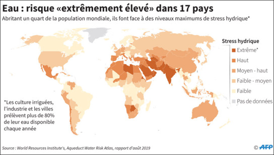 La France offre entre 2.500 et 6.000 m3 d'eau par an à chacun de ses habitants. L'Organisation mondiale de la santé (OMS) parle de stress hydrique lorsque la disponibilité en eau, par an et par habitant, est inférieure à 1.700 m3. Sous le seuil des 1 000 mètres cubes, on parlera de pénurie d'eau. Attention, le risque de stress hydrique ne plane pas que sur les pays chauds. Il concerne également des pays froids où le gel peut bloquer l'accès à l'eau liquide. Selon les prévisions du World Resources Institute, d'ici 2040, 33 pays seront en situation de pénurie d'eau, et la moitié de la planète sera soumise à un stress hydrique élevé.