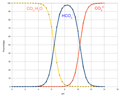 \(CO_2 + H_2O\) ⇔ \(H_2CO_3\) ⇔\( H^+ + HCO_3^-\) ⇔\( 2H^+ + CO_3^{2-}\)