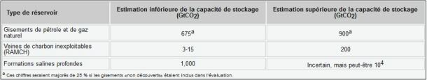 Maintenant, nous pouvons regarder les capacités de stockage géologique approximatives données dans le rapport du GIEC :