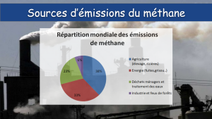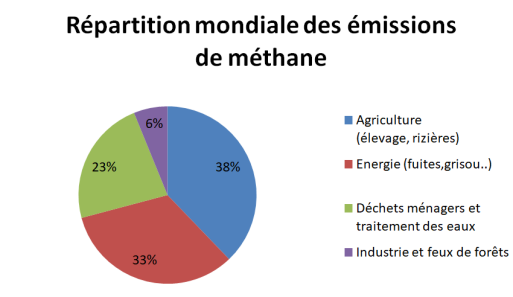 Les sources d'émissions du méthane sont variées, et plus nombreuses que les sources d'émissions du dioxyde de carbone. Elles sont à plus de 60% issues de l'activité humaine. On retrouve notamment des émissions dues à l'agriculture, en particulier l'élevage des ruminants et les rizières, mais également des émissions dues à l'exploitation et au transport de ressources non renouvelables, comme par exemple le charbon ou le pétrole.