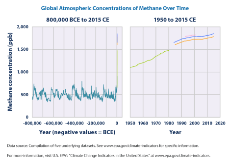 Cependant, il est aujourd'hui indéniable que l'activité humaine est grandement responsable des quantités de méthane présentes dans l'atmosphère, comme le montre le graphique ci-dessous, et qui représente les concentrations de méthane dans l'atmosphère depuis plus de 800 000 années.