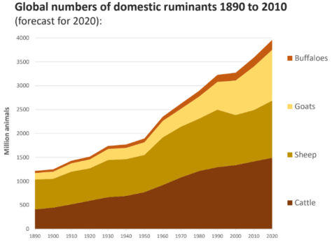 Ce phénomène est à l'origine d'une grande partie des émissions anthropiques de méthane, et le problème est croissant puisque il y a de plus en plus de ruminants d'exploités sur terre comme le montre le graphique donné ci-dessous :