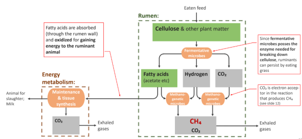 Le schéma ci-dessous (source : Stefan Wirsenius) explicite le fonctionnement du système digestif d'un ruminant.