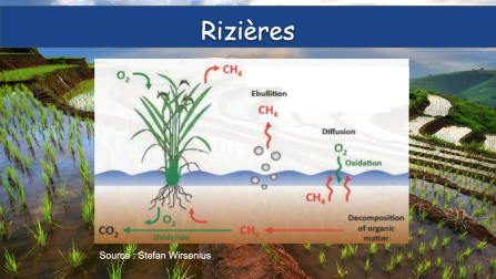 La majeure partie du riz mondial est cultivée dans des rizières inondées (Baicich, 2013). Dans ces conditions peu profondes, la décomposition aérobie de la matière organique épuise progressivement la plupart de l'oxygène dans le sol, entraînant des conditions anaérobies et une production de méthane. La majeure partie de ce méthane est oxydée dans le sol sous-jacent, tandis qu'une partie est dissoute dans les eaux de crue et lessivée. Le méthane restant est rejeté dans l'atmosphère, principalement par transport diffusif à travers les plants de riz, mais le méthane s'échappe également du sol par diffusion et bouillonnement à travers les eaux de crue (USEPA, 2016; Bridgham et al., 2013).( source : The Global Methane Budget 2000-2017)