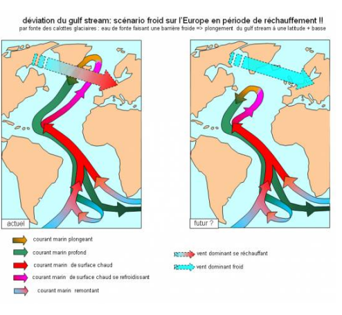 En effet, comme le montre le schéma donné ci-dessous, le Gulf Stream ne sera plus en mesure de réchauffer la masse d'air froid polaire qui arrivera de plein front sur l'Europe. Dans ces conditions, on retrouverait à Paris, le même climat qu'au Québec.
