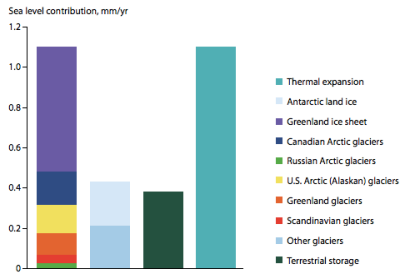 Cette dernière représente d'après l'AFP 35% de la hausse du niveau de la mer sur le dernier siècle [1]. D'après les figures 1 cela représente environ 0,7 mm/an en 2019 [1],[2], mais cela pourrait évoluer pour le scénario du GIEC le plus optimiste (RPC1.5) à une augmentation de 10 cm par an d'ici 2100 [2] (car les glaciers auront tous atteint leur pic d'eau d'ici 2100).
