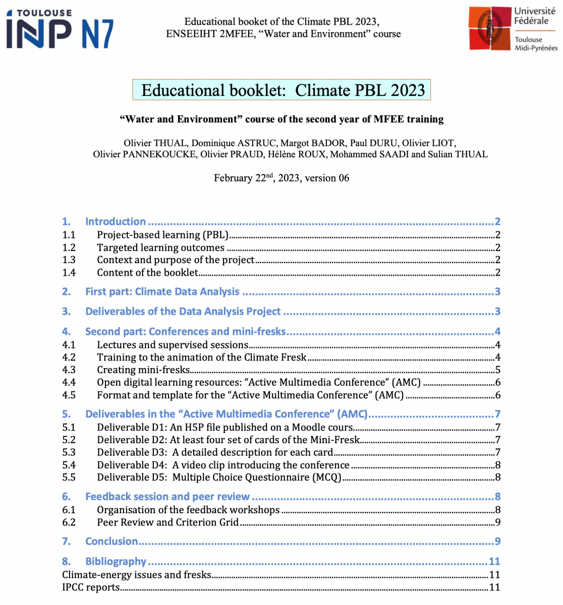 The organisation and contents of the Climate « Project Based Learning » (Climate PBL) courses are described in Pedagogical Booklets that M1 students of the « Fluid Mechanics, Energetics and Environnement » Department follow during three months with 50 hours programmed in their school timetable.