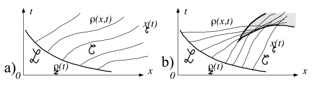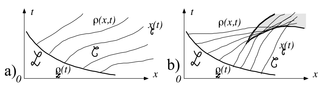 Dans les régions où ces courbes se coupent, les solutions du systèmes d'équations différentielles ordinaires conduisent à des fonctions \(\rho(x,t)\) multivaluées. Sur la frontière de ces deux types de régions, les solutions de l'équations aux dérivées partielles cessent d'être continues et il y a donc apparitions de chocs. Il faut alors invoquer d'autres équations (les relations de saut) pour calculer la dynamique de ces chocs.