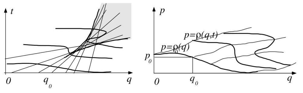 Mais il peut se faire que l'ensemble des positions ne puissent pas se mettre sous cette forme univaluée pour \(p\) mais sous la forme plus générale \(F_t(p,q)=0\) où plusieurs valeurs de \(p\) peuvent être associées à une seule valeur de \(q\). Cette situation se produit lorsque plusieurs courbes caractéristiques se coupent dans le plan \((x,t)\). L'équation d'advection scalaire cesse alors d'être valide dans la mesure où la solution n'est plus continue. Sur le plan de la physique décrite par le modèle, il faut spécifier des "relations de saut'' pour décrire la dynamique de ces chocs. Sur le plan des mathématiques, la résolution du système dynamique est un moyen de prolonger la résolution de l'équation aux dérivées partielles au-delà du temps où apparaît le choc. Mais cette prolongation n'a pas forcément de sens pour le problème physique modélisé.