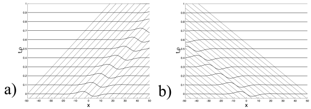 On peut donc voir les caractéristiques comme des rayons dont la vitesse prend en compte les variations de \(\rho\) dans le cas où les termes non-linéaires ne peuvent plus être négligés.