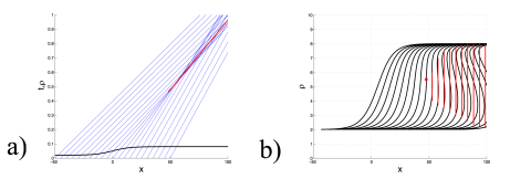 a) Condition initiale est droites caractéristiques. b) Solution \(\rho(x,t)\) à des instants successifs.