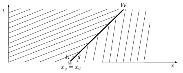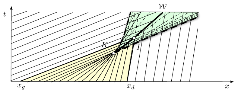 Pour l'exemple particulier considéré, on note \(K\) le point \((x_K, t_K)\) à partir duquel le choc prend naissance, et \(x=x_c(t)\) pour \(t\ge t_K\) l'équation de sa trajectoire \({\cal W}.\) Dans la mesure où \(\rho_0(x)=\rho_g\) pour \(x\le x_g\) et \(\rho_0(x) =\rho_d\) pour \(x\ge x_d\) sont constants à l'extérieur de l'intervalle \([x_g, x_d]\) on voit qu'à partir du point \(I\) situé à l'intersection des droites \(x=x_g+c(\rho_g) t\) et \(x=x_d+c(\rho_d) t\) ce qui définit ses coordonnées \((x_I,t_I),\) le choc est animé d'une vitesse constante