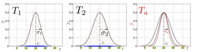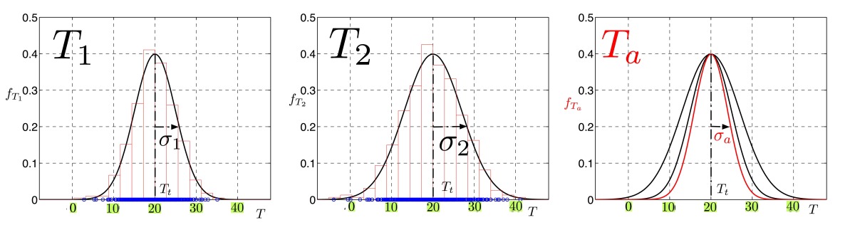 \(\displaystyle f_{T_1}(T) ={1\over \sqrt{2\,\pi} \; \sigma_1} \, \exp \left[{-{ (T-T_t)^2\over 2\,\sigma_1^2}}\right]\)