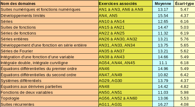 Parmi les domaines les moins bien réussis, dans deux d'entre eux les exercices nécessitent des connaissances de géométrie : « intégrale double et curviligne » et « fonctions de deux variables ».