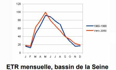 Les changements climatiques qui ont un impact sur ces facteurs, ont donc un impact sur le phénomène d'évapotranspiration. Cet impact est difficile à déterminer précisément, cependant des observations permettent de prévoir des pics d'EVT plus marqués en 2050 par rapport aux années 90 pour les même périodes de l'année.