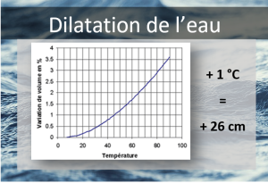 La dilatation de l'eau est le phénomène d'expansion volumique de l'eau sous l'effet d'une augmentation de température. Nous savons que la terre se réchauffe, réchauffant par la même occasion l'eau, qui se dilate, entraînant la montée des eaux.