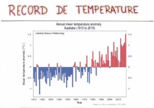 L'année 2019 a été, en Australie, l'année la plus chaude jamais observée avec une anomalie de température de +1.52°C par rapport à la moyenne 1961-1990 battant ainsi le record de 2013. Décembre 2019, lui aussi, a battu des records : c'est le mois le plus chaud jamais relevé avec une anomalie de +3.21°C par rapport à la moyenne 1961-1990.