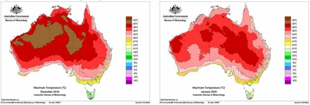 Ces températures extrêmes ont perduré durant le mois de Janvier 2020 comme le montre la Figure ci-dessous (température maximale moyenne en décembre 2019 à gauche et en janvier 2020 à droite) :