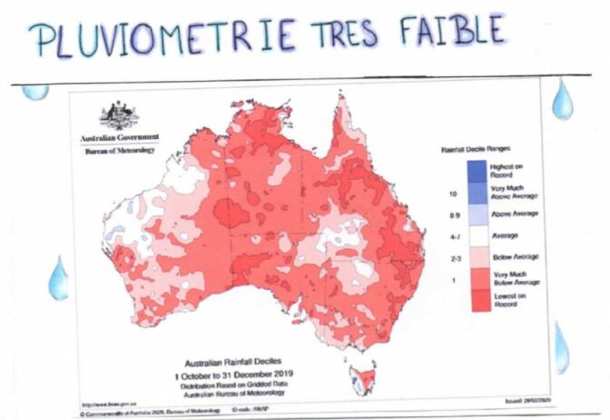 L'année 2019 est l'année la moins pluvieuse depuis 1900 avec un total de 277 mm en moyenne sur l'Australie soit 40% de moins que la normale. Durant le printemps c'est-à-dire entre le 1er Octobre et le 31 Décembre 2019, la quasi-totalité du pays atteint des niveaux très bas de précipitation ce qui en fait le printemps le plus sec depuis 1900. Aucune région n'est épargnée et de nombreuses stations ont vu leur record battu.