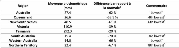 Le tableau ci-dessous résume les déficits de précipitation sur l'ensemble de l'Australie durant le printemps 2019 :