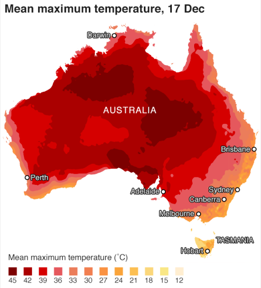 L'image ci-contre représente les températures moyennes enregistrées en Australie le 17 Décembre 2019. [3]
