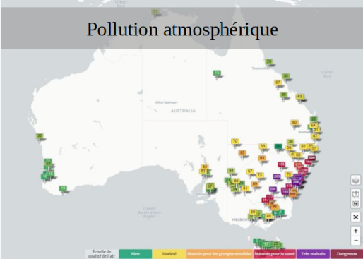 Cette pollution atmosphérique est inquiétante car elle va entraîner des problèmes sanitaires en Australie et perturber son environnement ; ainsi que modifier le climat de la planète. En effet, comme nous pouvons constater sur la carte ci-dessus, les indices de la qualité de l'air à l'Est de l'Australie (notamment les grandes villes telles que Camberra et Sydney) sont très élevés, et ce au point de dépasser ceux des villes les plus polluées au monde. Par exemple, selon le site waqi.info (qui donne la pollution de l'air dans le monde en temps réel), on a observé le 8 janvier des indices de qualité de l'air de plus de 170 à Camberra, 180 à Sydney et 2140 à Port Macquaire (le seuil de danger à respirer étant à 200). On a même enregistré un indice de 4758 à Camberra en début janvier lorsque des conditions particulières ont fait que les fumées y soient restées bloquées. En effet, les relevés de particules fines PM2,5 (les plus dangereuses) dépassaient 100µg/m³ dans de nombreuses villes au sud-est de l'Australie, et ont même atteint des taux au-dessus de 400µg/m³ à Camberra (contre environ 50 à Paris dans cette période par exemple).