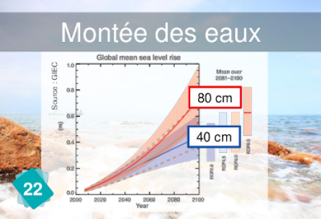 Selon le rapport du GIEC, à la fin du siècle, la montée du niveau des eaux est prévue d'être plus rapide selon tous les scénarios envisagés, incluant ceux compatibles avec l'atteinte des objectifs à long termes des accords de Paris.