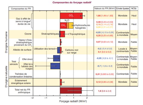 Cependant, le forçage radiatif lié à l'effet albédo des nuages n'est pas chiffré de manière précise. L'incertitude est telle que l'on estime que le forçage radiatif des aérosols par effet albédo des nuages pourrait compenser celui induit par le \(CO_2\) !