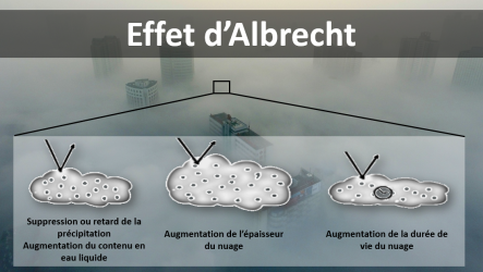 Si la présence d'aérosols conduit à une diminution de la taille des gouttelettes d'eau nuageuse, il s'ensuit que le processus de coalescence va prendre plus de temps pour former des gouttelettes d'eau de taille suffisante pour précipiter. Il se peut aussi que le nuage s'évapore avant d'avoir eu le temps de précipiter. Dans ce cas, la vapeur d'eau ira se condenser plus tard dans l'atmosphère et aura une chance supplémentaire de précipiter. Au final, le second effet indirect des aérosols induit un retard dans le développement des précipitations et une augmentation de la durée de vie des nuages. Celle-ci peut s'accompagner d'un développement vertical et horizontal plus important du nuage.