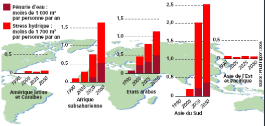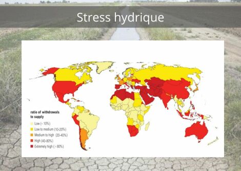 La France offre entre 2.500 et 6.000 m3 d'eau par an à chacun de ses habitants. L'Organisation mondiale de la santé (OMS) parle de stress hydrique lorsque la disponibilité en eau, par an et par habitant, est inférieure à 1.700 m3. Sous le seuil des 1 000 mètres cubes, on parlera de pénurie d'eau. Attention, le risque de stress hydrique ne plane pas que sur les pays chauds. Il concerne également des pays froids où le gel peut bloquer l'accès à l'eau liquide. Selon les prévisions du World Resources Institute, d'ici 2040, 33 pays seront en situation de pénurie d'eau, et la moitié de la planète sera soumise à un stress hydrique élevé.