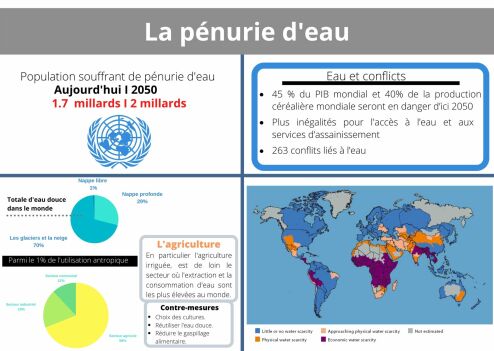 La pénurie d'eau refuse le sixième objectif de développement durable, aujourd'hui plus de 1.7 millards de personnes vivent dans zones où la quantité de l'eau douce utilisée est supérieure à celle disponible. D'ici 2050, 2 milliard de personnes risquent d'avoir son accès réduit aux ressources en eau douce. Ce problème a un impact négatif sur la sécurité alimentaire et il est lié aux maladies d'origine hydrique.