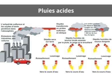 Ce que l'on nomme communément “pluies acides” regroupe deux phénomènes : la déposition sèche et la déposition humide caractérisée par un pH inférieur à 5,6. Les temps chauds et secs peuvent augmenter les pluies acides.