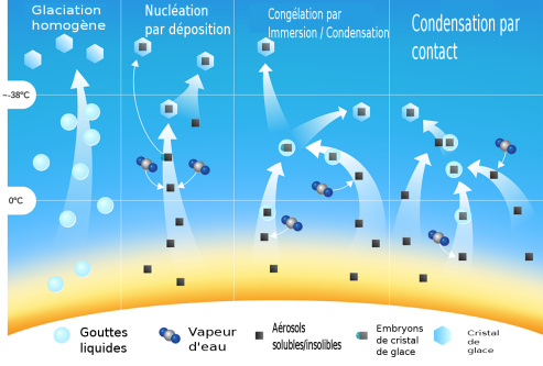 Les aérosols entrent en jeu lors de la formation de noyau de condensation. Les particules solides s'entourent de vapeur d'eau qu'elles font se liquéfier pour former une gouttelette.