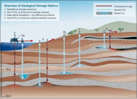 Les méthodes de stockage potentielles sont les suivantes : le stockage géologique (dans des formations géologiques telles que les gisements de charbon inexploitables, de pétrole et de gaz), le stockage océanique (rejet direct dans la colonne d'eau de l'océan ou sur les fonds marins) et la fixation industrielle du \(CO_2\) dans des carbonates inorganiques. Il existe également la réutilisation industrielle du \(CO_2\), mais cela ne devrait pas contribuer beaucoup à la réduction du \(CO_2\).