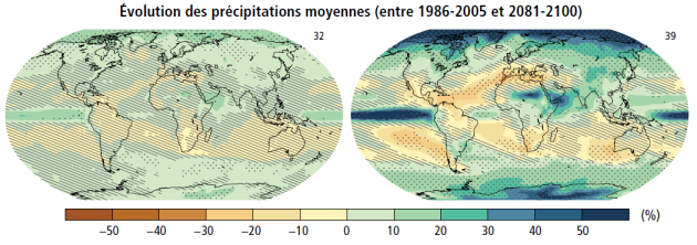 Ce graphique représente l'évolution des précipitations moyennes fondées sur des projections multimodèles moyennes pour la période 2081–2100 par rapport à la période 1986–2005, selon les scénarios RCP 2,6 (à gauche) et RCP 8,5 (à droite).