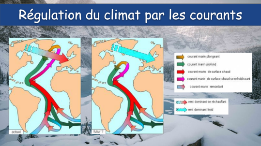 Les courants marins sont les grands régulateurs du climat planétaire. Leur perturbation pourrait engendrer des répercussions majeures sur le climat des zones côtières proches des courants concernés.