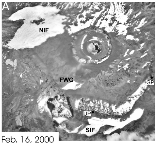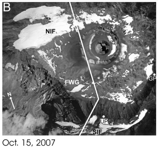 Sachant que les glaciers tropicaux n'évoluent pas beaucoup au cours des saisons de fonte et d'accumulation, on voit donc bien à l'œil la diminution de la superficie du glacier.