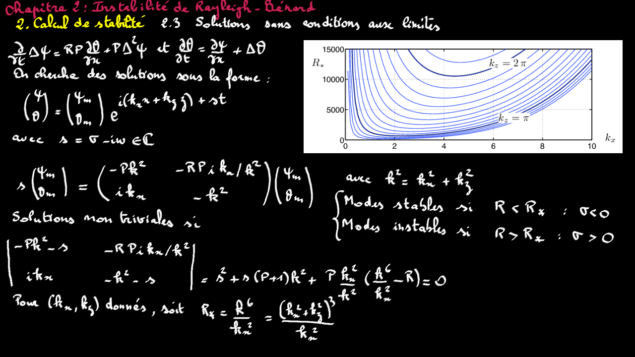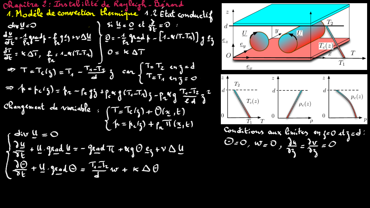 Le chapitre détaille les calculs permettant d'étudier l'instabilité de Rayleigh-Bénard, lorsque lorsque qu'une couche fluide est soumise à un gradient vertical de température qui dépasse un seuil critique.