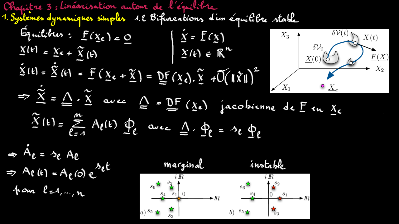 Le chapitre explore la notion de linéarisation autour d'équilibre pour des systèmes dynamiques plus simples que les équations de l'hydrodynamique, afin de dégager la généricité des bifurcations décrites dans les deux premiers chapitres.