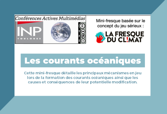 Dans cette « Conférence Active Multimédia » (CAM), nous détaillons les principaux mécanismes des courants océaniques ainsi que les causes et conséquences de leurs modifications. Cette CAM est basée sur le principe de « La Fresque du Climat »[1].