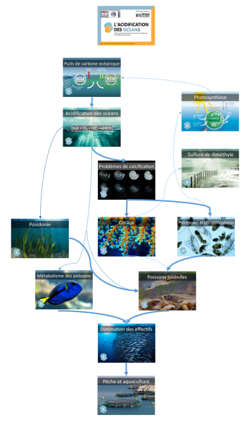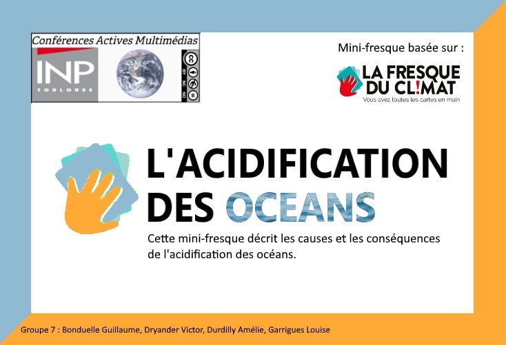 Dans cette « Conférence Active Multimédia » (CAM), nous détaillons les principaux mécanismes de l'acidification des océans ainsi que les causes et conséquences de celle-ci. Cette CAM est basée sur le principe de « La Fresque du Climat ».[1]