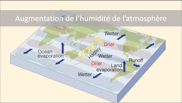 En raison de l'augmentation de la température, la quantité de vapeur d'eau presente dans l'atmosphere et bien plus grande, et donc est les mouvement des masses d'air sont aussi influencés. Cela change les tendances de precipitation dans les régions.