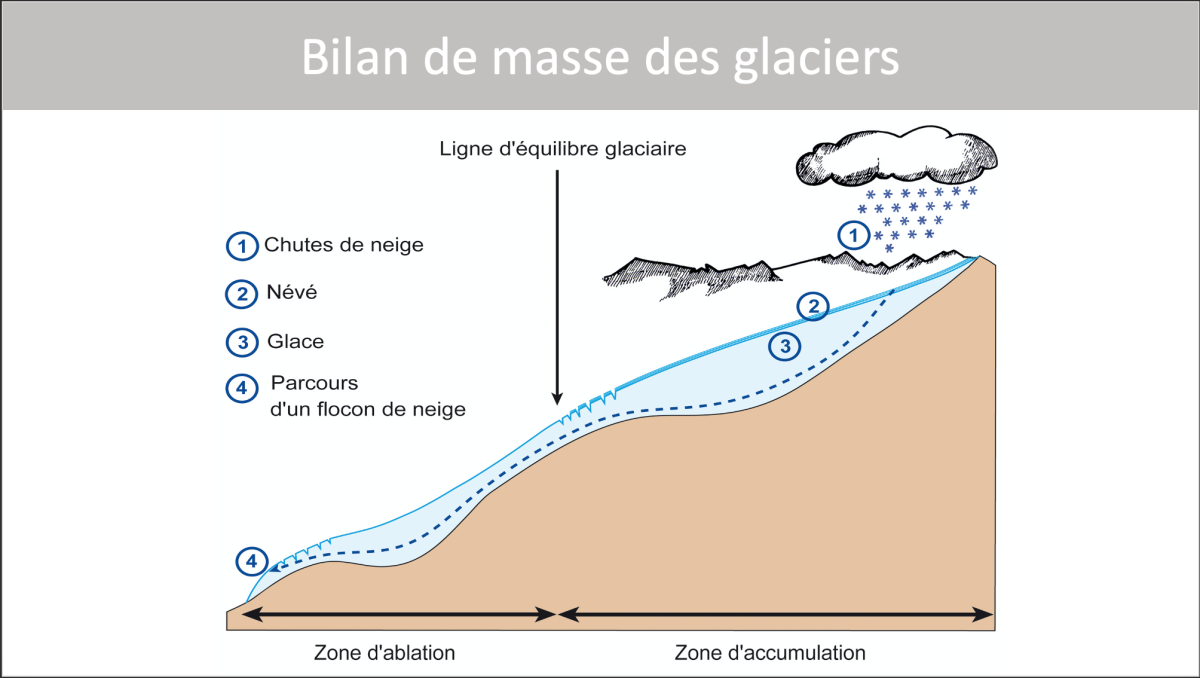 Le bilan de masse d'un glacier est composé par 3 zones : la zone d'accumulation, la zone d'ablation et la ligne d'équilibre glaciaire.