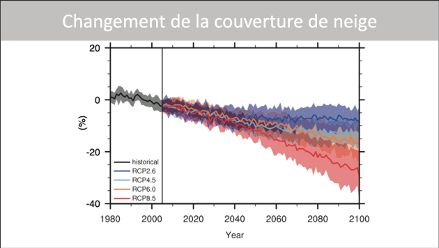 La couverture de neige répond aux variations dans les precipitations et l'ablation du bilan de masse glaciaire. Il est donc attendu que la couverture sera réduite. La hausse de la température réduit aussi la quantité de precipitation qui tombe en forme de neige et finit par promouvoir la fonte de la neige.
