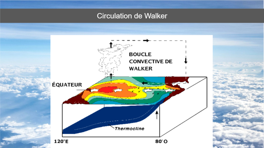 Les Alizés, vents provenants du Sud-Est dans l’hémisphère Sud, couplés au courant de Humboldt et à l’upwelling sur la côte sud-américaine, refroidissent l’air la surplombant et conduisent à une différence de température entre le Pacifique est et ouest. Cela donne naissance à un régime de brise sur le Pacifique sud-équatorial et un effet de seiche (niveau de l’eau 60 cm plus haut à l’ouest). C’est cette cellule de convection, particulièrement importante dans cette région, que l’on nomme cellule de Walker. Elle se traduit donc entre autres par un gradient de pression d’ouest en est, des eaux plus froides sur la zone est et des précipitations exclusivement sur la zone ouest.
